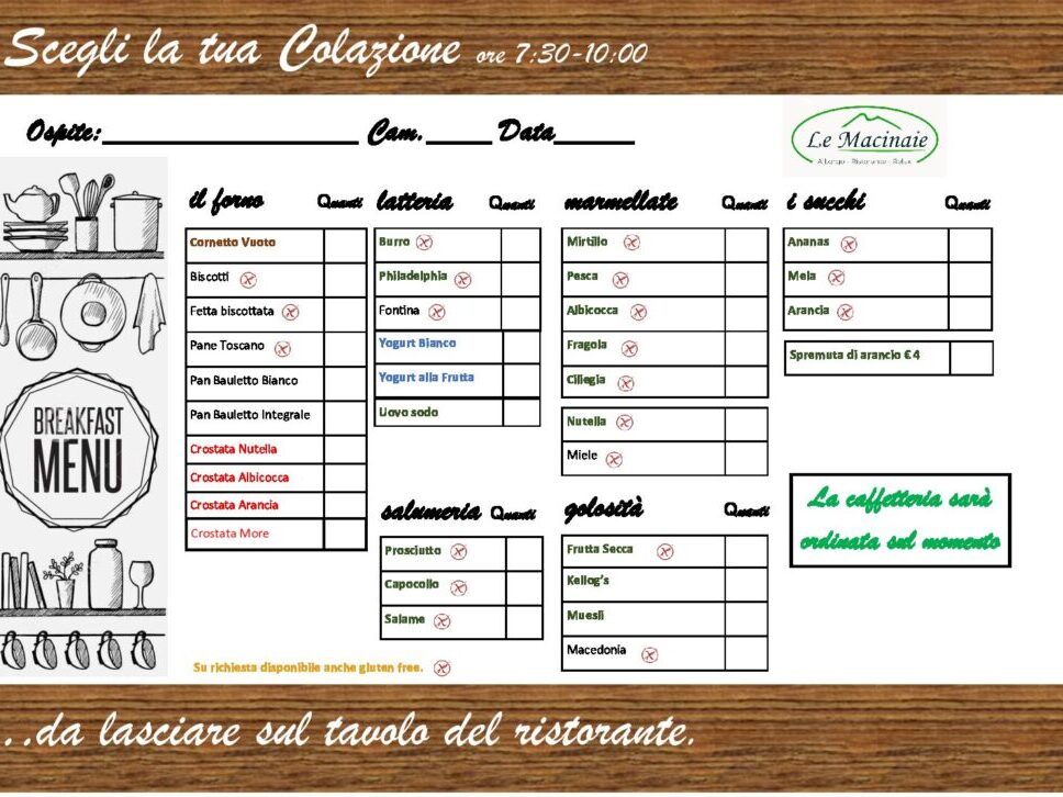 A cena i nostri ospiti hanno sul tavolo il menù della colazione da ordinare il giorno successivo.